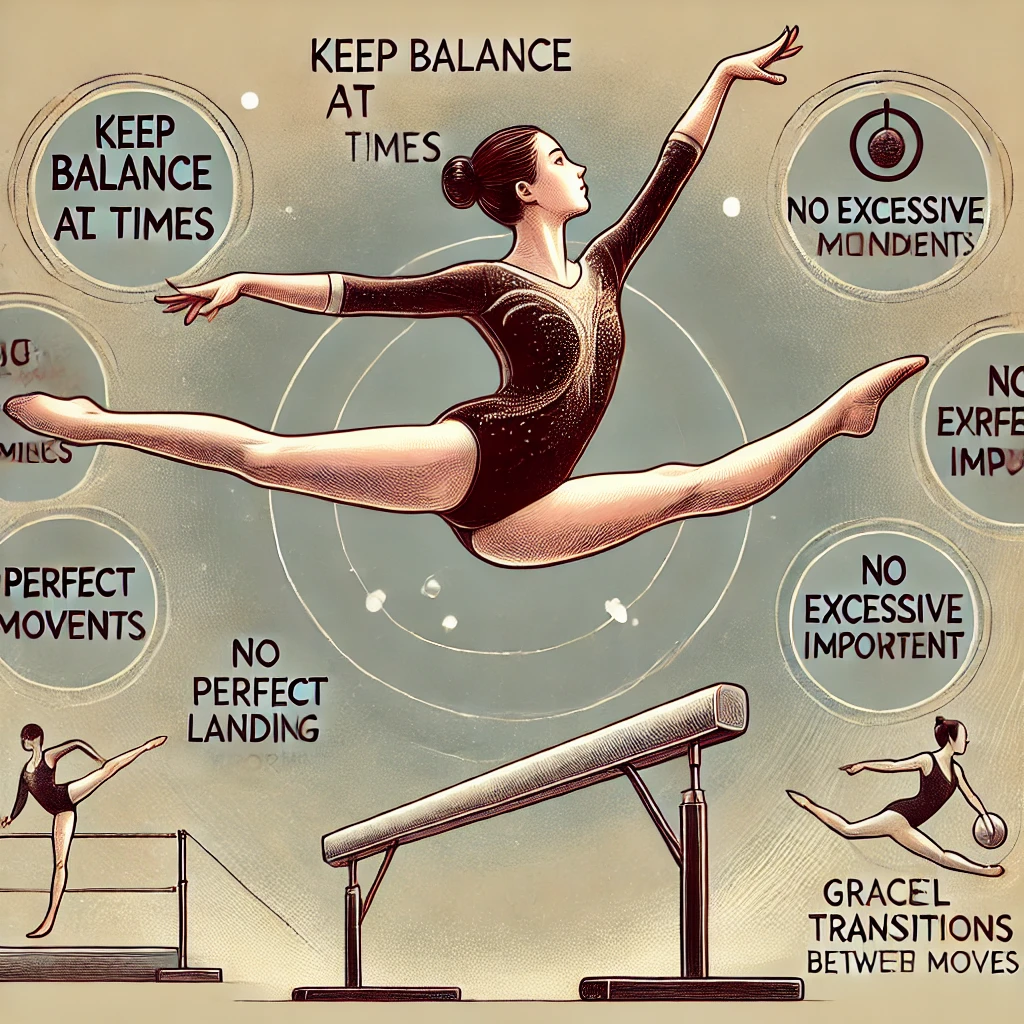 - 복장 규정: 선수는 규정된 체조복을 착용해야 하며, 복장이 심판의 주의를 산만하게 하거나 불쾌감을 줄 경우 감점될 수 있습니다.